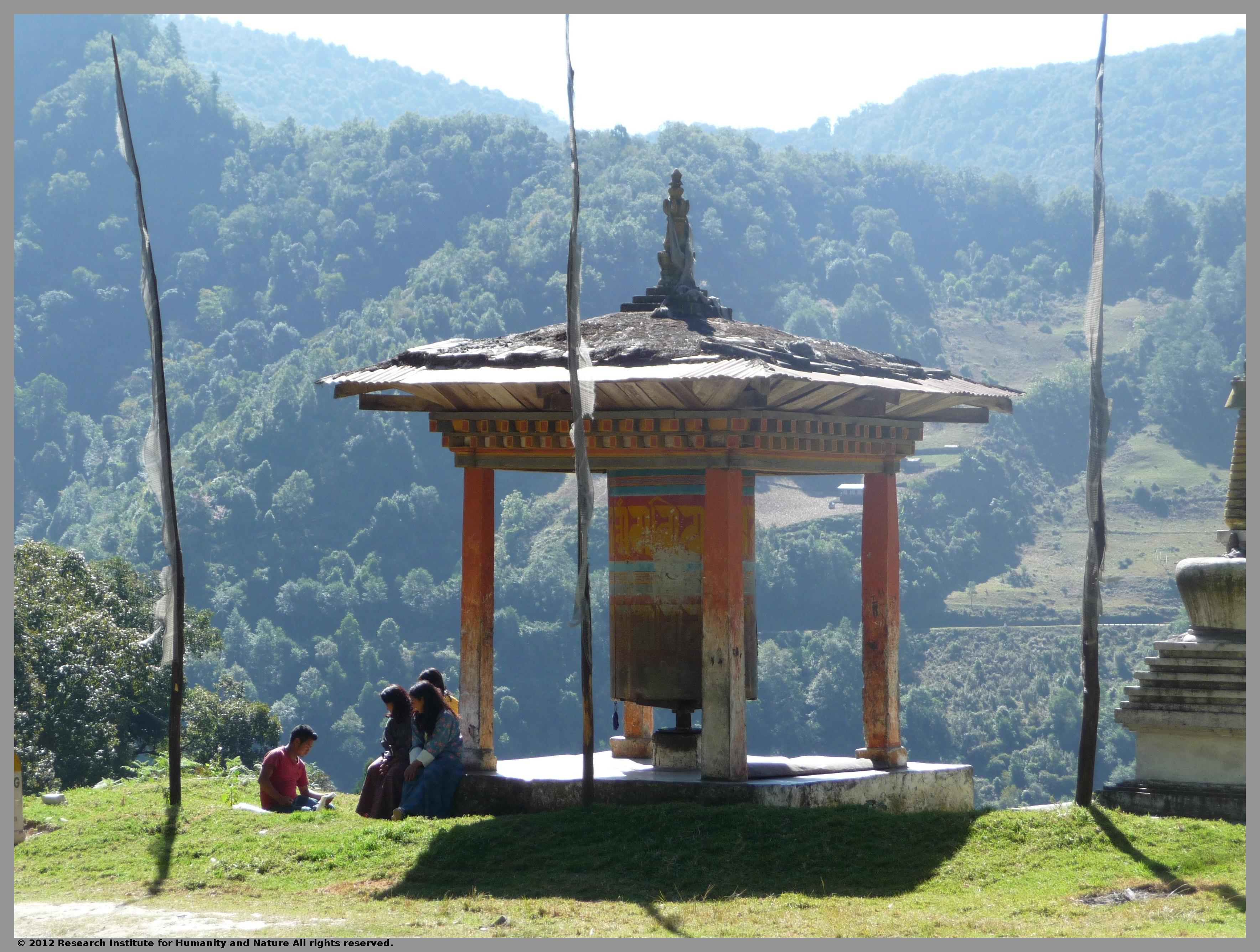 | 備考 | カリン診療所から撮影した向かいのマニ車の写真です。診療を手伝ってくれたソナムと妻と妹、従姉が談笑しています。私もよくこのマニ車を回していました。 |